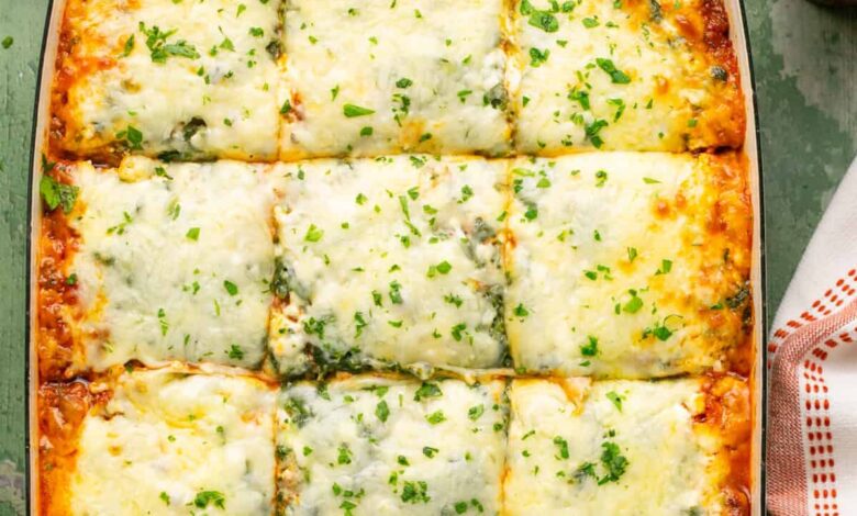 Top with freshly chopped parsley and cut into 12 equal servings and enjoy this easy lasagna recipe.